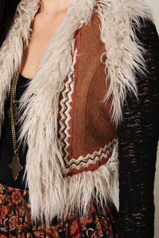 | Embroided faux fur gilet gives sophisticated shift dress right bohemian touch. Free People. |